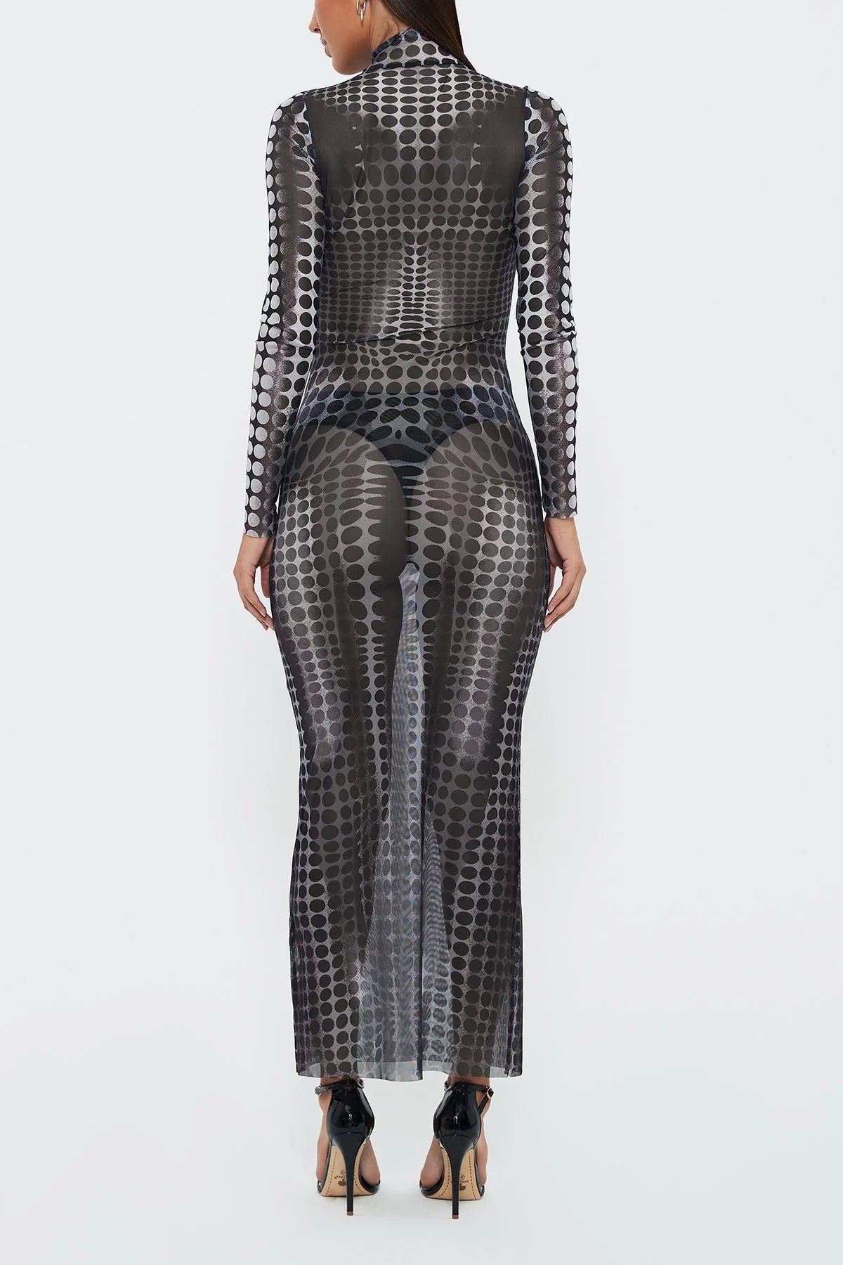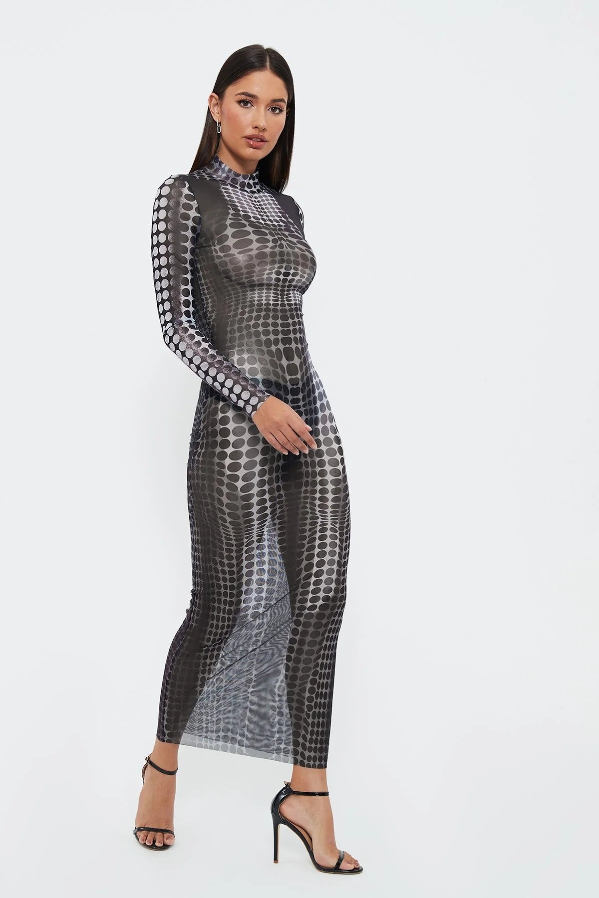 2023 Women's New Sexy See -through Mesh Printed High -waist Slim Long Dress