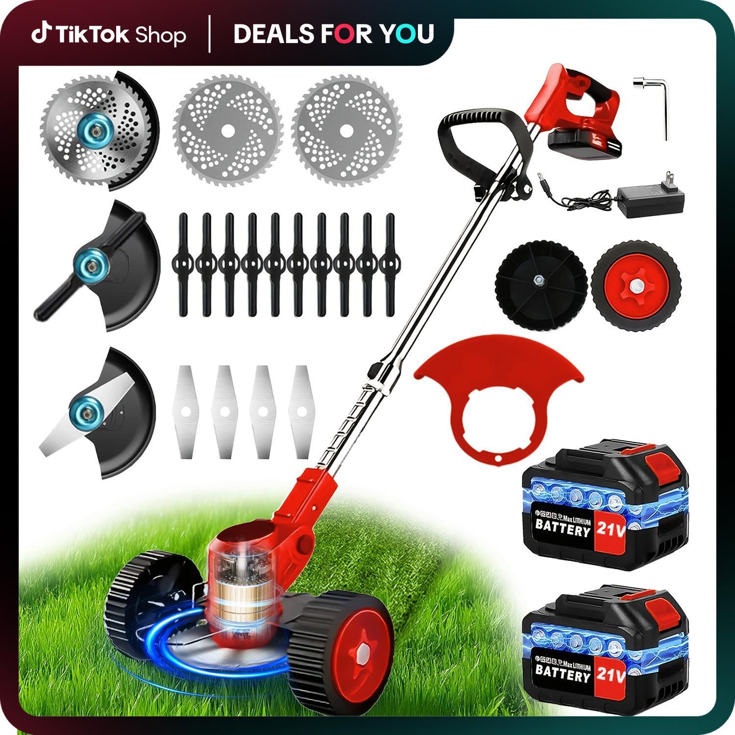 21V Electric Weed Eater With Wheels,Cordless Battery Weed Wacker With Charger, 2Batteries,3 In 1 Brush Cutter String Trimmer Grass Trimmer Lawn Mower,Edger For Garden And Yard Lawn,dealsforyoudays