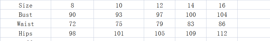 Size: 6 Bust 88cm Waist 70cm, 8 Bust 90cm Waist 72, 10 Bust 93cm Waist 75cm, 12 Bust 97cm Waist 79cm, 14 Bust 100cm Waist 83c, 16 Bust 104cm Waist 86c