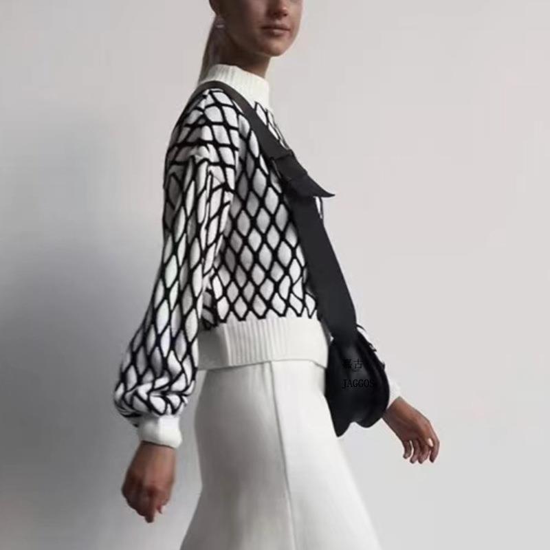 Lantern Sleeve Plaid Loose-fitting Sweater