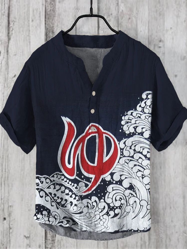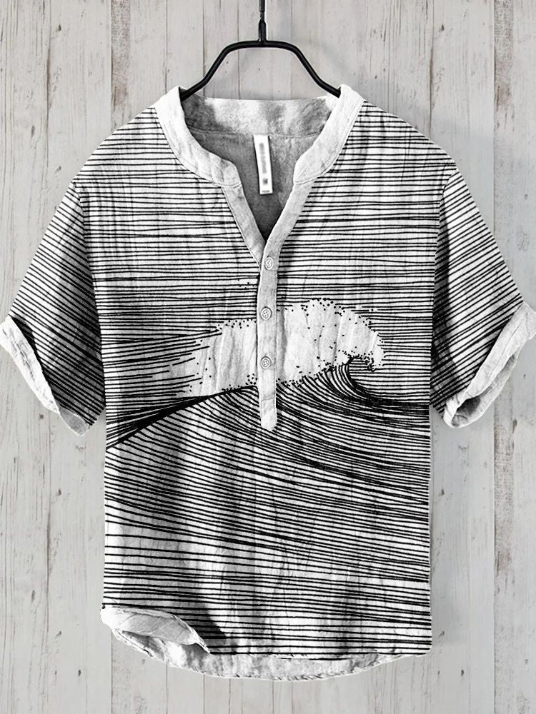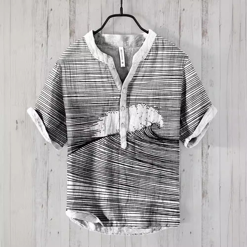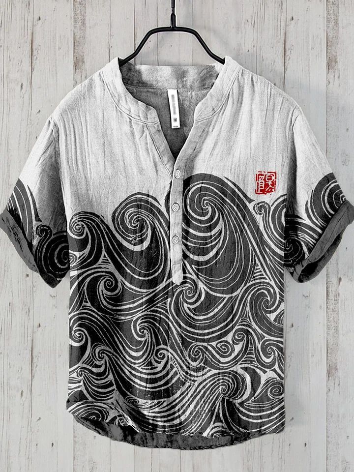 Literary Men's Ocean Print Linen Short Sleeve Loose Casual Top