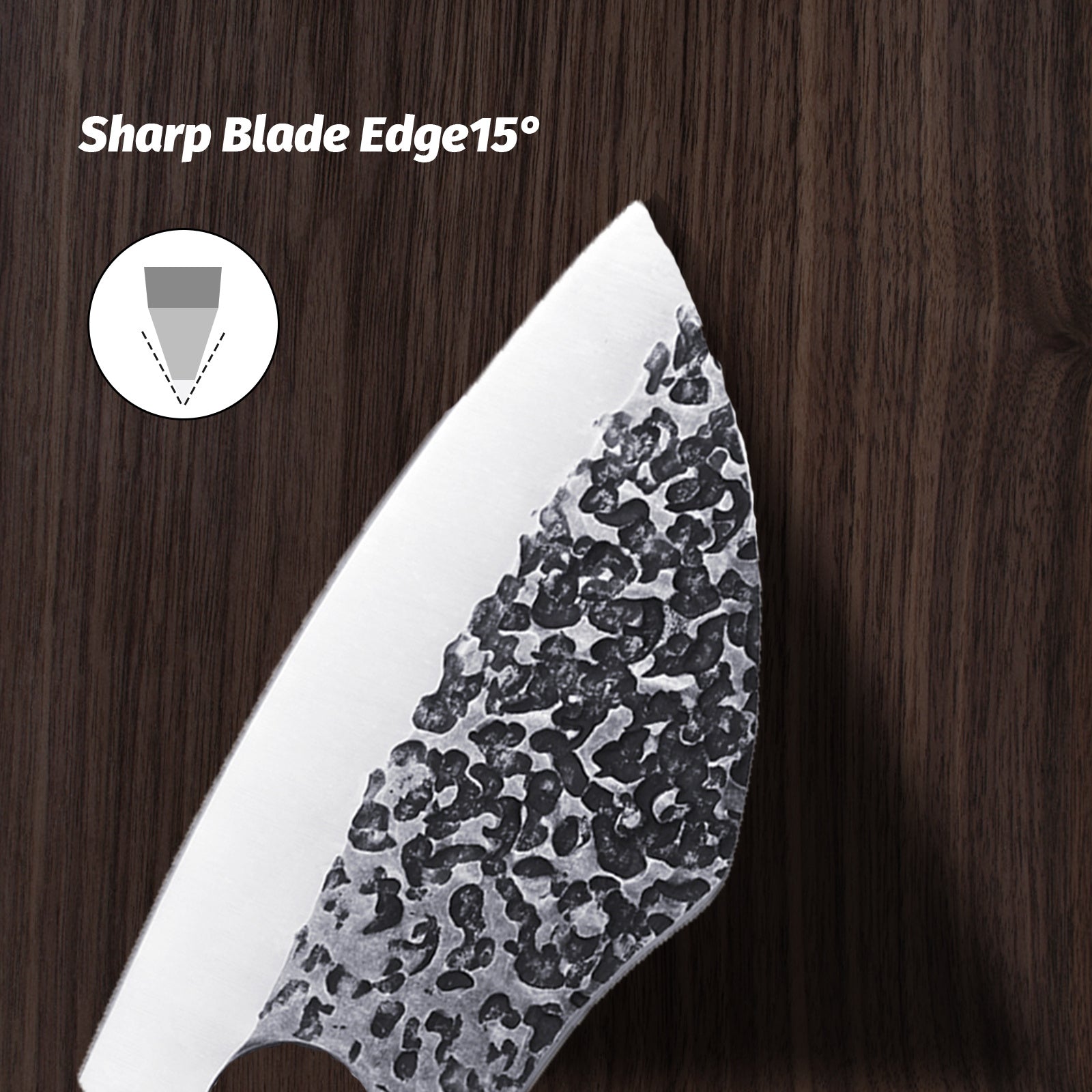 - Hand Forged Texture - This knife is made of good steel and it holds a blade well. Finger holes on the blade adds to the safety and stability during use.