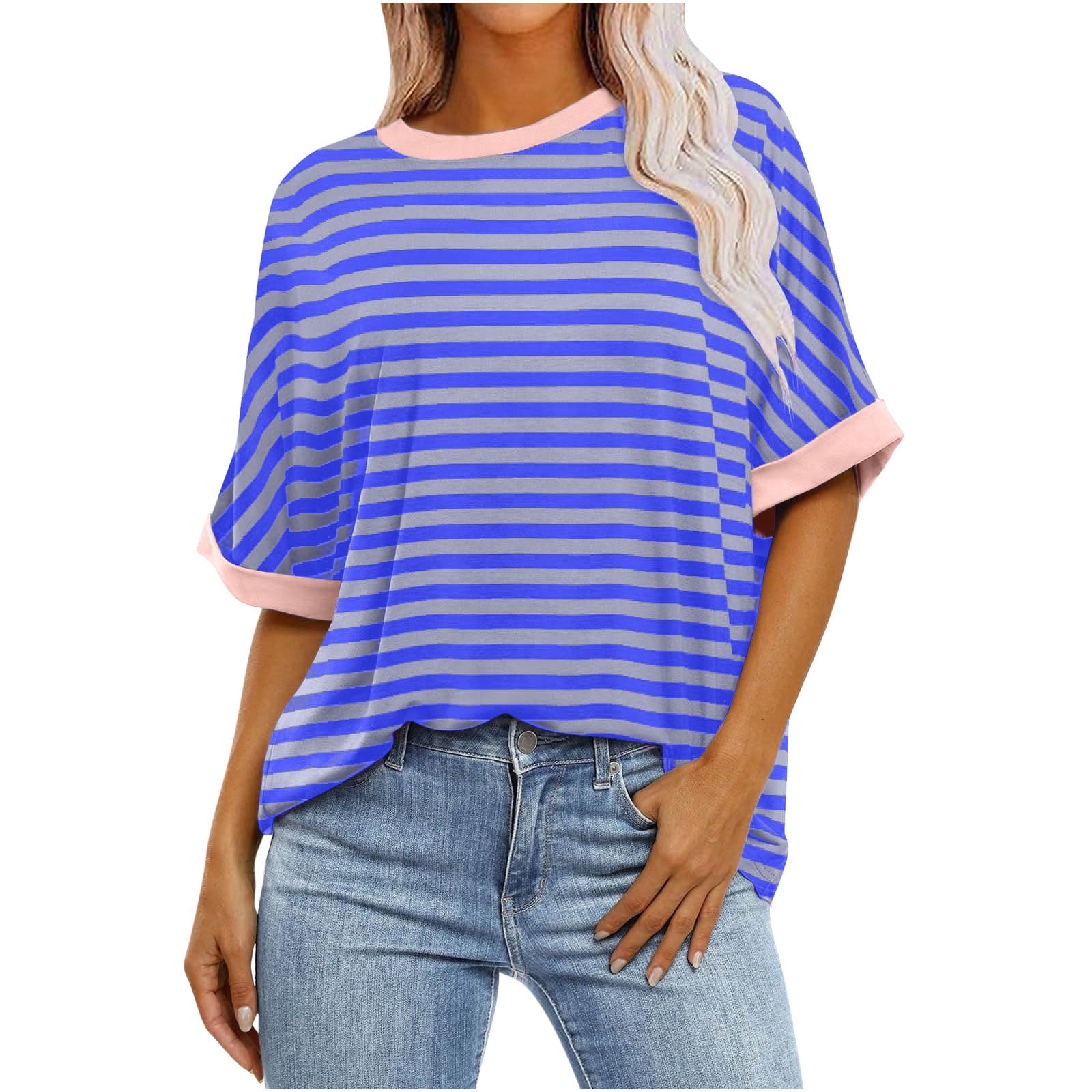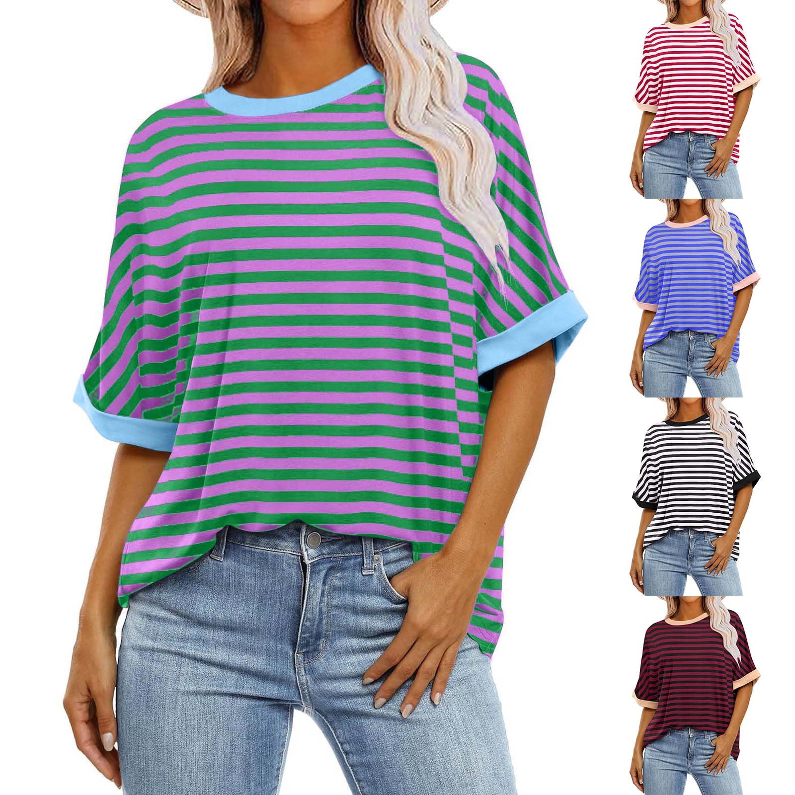 Women's Striped Printed Loose Color Matching Short Sleeve
